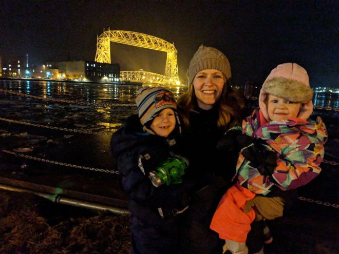 The other day my husband and I decided to take a spur of the moment road trip to Duluth which we had been debating doing for a few weeks and decided it was now or never and just went for it. I very carefully packed everything we needed for the night in just a couple bags and we hit the road. As expected our 4 year old son slept while our 2 year old daughter talked and sang the whole way, she’s never been one to sleep during rides, thankfully it wasn’t screaming and crying. The truck was full of excitement as we drove into town. Little feet ran down the hallway at the hotel full of joy. Shortly after we got our bags in our room we realized we forgot the most important one, the one with the special blankies, pajamas and snow gear which was important because this whole trip was essentially to see the Christmas lights at Bentlyville and of course our love for Duluth. Time froze for a minute, 2 hours one way, there is no way we could go back or have anyone bring it to us. Before fear could set in I announced what was forgotten and how we would fix it and surprisingly the news was taken rather well. During our drive to Target to replace all the items we got to see a side of Duluth we had never seen and never knew so much rested up in those hills. As you can imagine we left with more than we came for and along with those extra items we took with us a memory that made our trip unforgettable. Before we began our next journey we stopped to get a snack and enjoyed watching our daughter drink down a glass of chocolate milk so fast we wondered if she even tasted it, you know you have done that and if you haven’t you should! The new Rescuebot our son picked out of course made everything better and once we were all bundled up, came with us to see the lights. We found parking along the lake, neither distance or the fact that my daughter wanted me to carry her the whole way mattered, it was a beautiful walk. The lights were amazing and the crowd turnout was stunning. It all felt like the time lapse video we took. Going off course avoiding the mile long line to see Santa we got to see a ship come into harbor, which is worth it if you haven’t had the opportunity especially if you have a 4 year old son. To make the long walk back shorter we raced to the truck and in a full sprint to the finish I picked up my almost 40 pound son and carried him, he excitedly announced that we almost won.  Next stop was a late dinner and football. All made worth it in the end to watch my daughter savor some vanilla ice cream and cheers daddy with her spoon. It really is the little things that you need to stop and appreciate. A 10pm bedtime for a 2 year old with no nap should I say more? After a failed attempt to get my daughter to sleep in her pack n play I took her in my bed for the first time ever.  The pillows I stacked on one side to protect her from rolling off the bed also helped block the light from the bathroom light my son needed on to make the room not so dark.  The sleepless tossing and turning we both did was all worthwhile with the occasional “mommy” followed with a snuggle usually after bumping her head on the headboard. Best of all the new blankies were given a warm tear free welcome. In the morning, after rubbing my sleepy, baggy eyes I looked at the time and saw it was 7:30 and opened up the curtains to the most amazing sunrise over Lake Superior. I instantly felt awake and excited for the day. We stopped and had a delicious breakfast and hit the road. To our amazement both of our kids slept, at least for a little while. This all took place on day 2 of my mission to stop complaining. With all of the changes I have made to better myself and live my best life it was brought to my attention that I was forgetting something, something very important, to stop complaining. I feel this trip was a test and I passed. Through every obstacle and trial I didn’t allow myself to complain and it really made me enjoy every moment. The day before this trip I listened to a podcast about not complaining and in one of the stories the lady talked about chipping a fingernail, coincidence or not during this trip I chipped a nail and actually just smiled about it, remembering the story.  Later when my finger was rolled up in a window I laughed to the point I cried.  If you complain you remain, no matter what it is you are trying to change.  It’s not the stuff going on around you that makes you unhappy it’s how you respond to the stuff going on around you. Whether you are going on a road trip or just going about an ordinary day, experience it on No Complaining Street and you will find so much more joy.